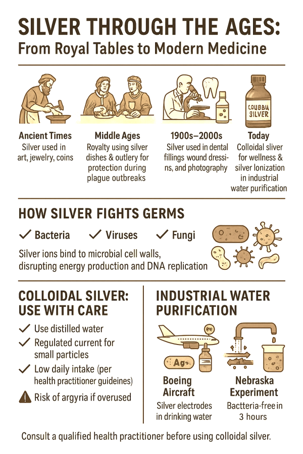From royal banquets during the plague to high-tech water purification systems today, silver continues to protect people against harmful microbes. Colloidal silver, when properly made and used responsibly, is one of the many ways we can harness this ancient metal’s power to support modern health.